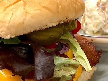 All sandwiches are available on white, wheat, croissant, or bun and include potato chips, corn chips, or homemade potato salad. Sub soup, green salad, or fry basket for $3, or fruit for $1.50. Add Mississippi caviar, spinach dip, hummus, or cheddar corn dip for $1.50.